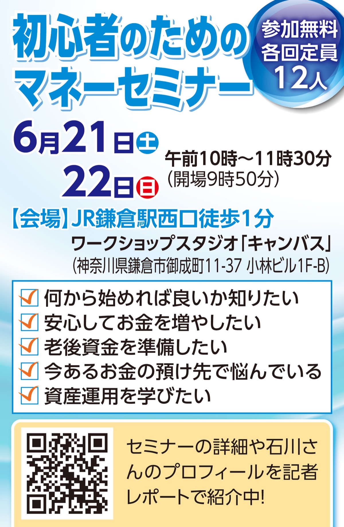 「これからの人生に必要な資金は?」「資産運用の方法を知りたい」など、お金に関する不安や悩みを持つ人に向けた「初心者のためのマネーセミナー」が6月21日(土)と22日(日)の午前10時から11時30分まで、JR鎌倉駅すぐのワークショップスタジオ「キャンバス」で行われる。参加無料。