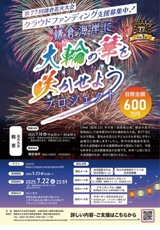 約2500発が打ち上がる「第77回鎌倉花火大会」が、7月18日(金)に鎌倉海岸(由比ヶ浜海岸・材木座海岸)で午後7時20分から8時10分に開催される。昨今の物価高で運営費が高騰しており、財政難に直面している同大会。実行委員会では5月23日にクラウドファンディングを立ち上げ、「伝統の花火を継続できるようご支援を」と呼びかけている。