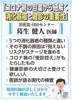 市民公開講座では、5つの消化器癌の種類と違い、コロナ禍による受診控えの影響、早期健診の重要性などをわかりやすく解説する。講座の予約は同院の専用フォームで受付中。