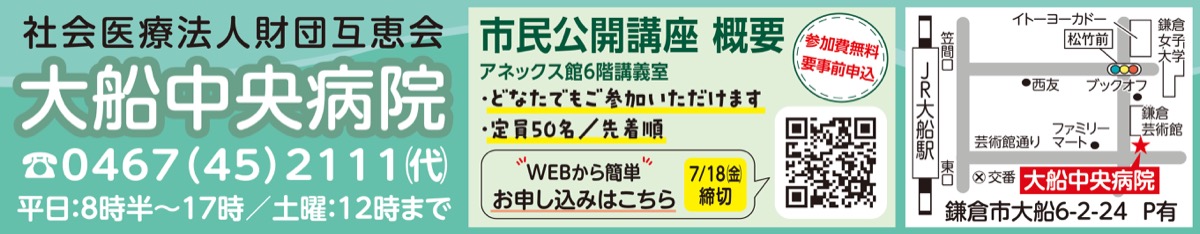 大船中央病院で7月19日(土)、「市民公開講座」が開催される。同院アネックス館6階講義室で午前11時から約1時間(10時30分開場)。詳細な医療情報を聞けると毎回人気の同講座。今回は「コロナ禍の自粛から紐解く消化器癌と健診の重要性」をテーマに、消化器・IBDセンターの葛生健人医師が講演する。