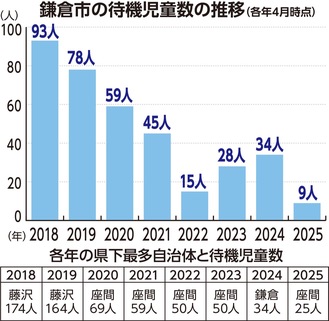 鎌倉市は18年以降、待機児童数が県内自治体で2番目に多い状況が続いていたが、34人だった昨年は県内最多だった。