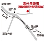 腰越の戦没者慰霊碑は、かつて腰越小学校にあったものを1950年に地域の遺族や住民が協力して現在地(腰越5の11)に移したという。日清戦争や日露戦争、第一次世界大戦、太平洋戦争等の戦没者を合祀し、慰霊碑に並ぶ石板には300人を超える名前が刻まれている。