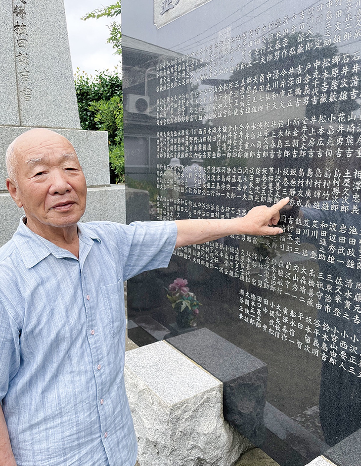 「小学校からの帰りに、突然空から『バリバリバリ』と凄い音がしたのは今も忘れられない」と話す。この時は、近くの家で屋根を貫いた弾によって亡くなった人もいた。「社会から戦争の記憶が薄れていくのは、平和であるからと考えれば良い事なのかも知れない。でも、戦争で亡くなった人を悼む気持ちは、いつまでも忘れてはいけないと思う」と、坂巻会長は石板を眺める。