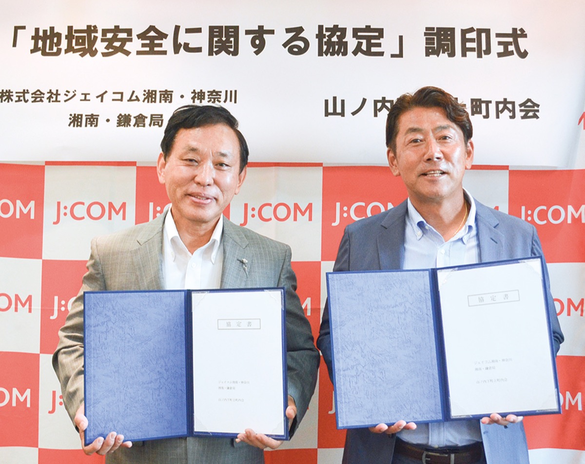 株式会社ジェイコム湘南・神奈川 湘南・鎌倉局(秋本一茂局長)と山ノ内下町上町内会(柴田勝五会長)は、地域安全に関する協定を8月28日に締結した=写真。鎌倉市内では、昨年12月の山ノ内下町下町内会に続き、2カ所目。
