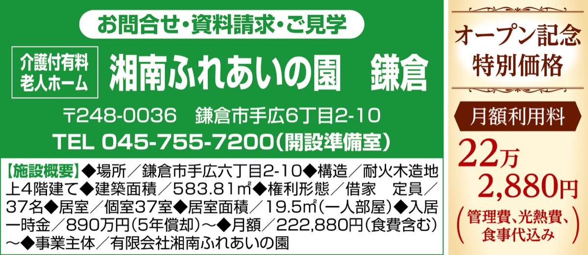 鎌倉市手広交差点近くに介護付有料老人ホーム「湘南ふれあいの園 鎌倉」が11月中旬(予定)にオープンする。現在、入居者を募集中。2005年に開設したナーシングローズヴィラ鎌倉の新規移転に伴うもの。