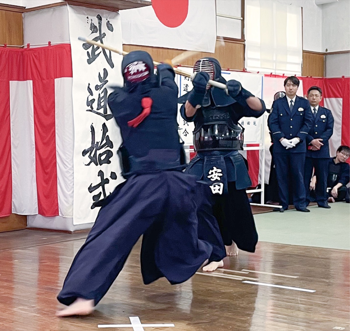 大船警察署武道場では、警察署員が松尾崇市長ら来賓を前に熱戦を繰り広げた。柔道と剣道では勝ち抜き数を競う高点試合が行われ、試合の勝者に次々と署員が戦いを挑んでいった。