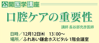 御成町のふれあい鎌倉ホスピタルでは、参加無料の市民向け公開医学講座を定期的に開催している。12月12日(木)は歯科口腔外科の長谷部充彦医師が「口腔ケアの重要性」をテーマに講演を行う。
