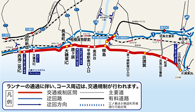 西湘バイパス(西湘二宮IC)〜国道134号(江の島入口)間/午前8時〜午後3時45分頃・上下線通行止め、新湘南バイパス(茅ヶ崎西IC)〜(茅ヶ崎海岸IC)間/午前8時〜午後1時30分頃・下り線通行止め、国道1号(大磯警察署前)〜(大磯プリンスホテル)間/午前6時〜9時頃・通行止め、国道1号(国府本郷)〜西湘バイパス(大磯西IC)間/午前6時〜午後3時45分頃・通行止め