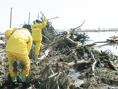 「東日本大震災」の被害を受け、全国規模の消防組織「緊急消防援助隊」が結成。茅ヶ崎市消防署は震災のあった11日夜、被災地の宮城県仙台市宮城野区に向け第一次隊7人が出発し、人命検索救助活動に当った。