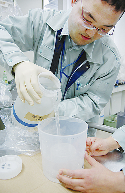 測定したのは市内東海岸南のヘッドランド。12日に県保健福祉事務所職員がバケツで10リットルを採水。そのうち3リットルが衛生研究所に届けられた。衛生研究所ではさらに2リットルを特製ビーカーに移し、放射能測定器で測定した。