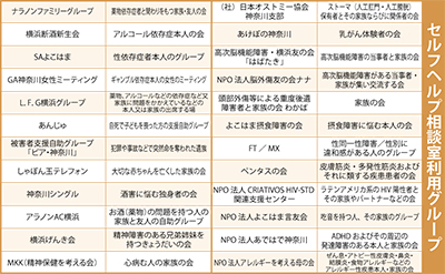 セルフヘルプ活動の詳細及び下記団体についての問合せは、かながわボランティアセンター【電話】045─312─1121(代)まで。