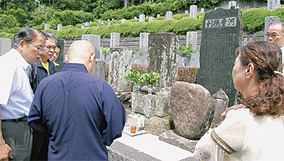 川根本町は主人公のモデルとなった三堀五郎兵衛の墓や実物の河童徳利などがある土地。以前まで墓は茅ヶ崎市円蔵にあったが、昭和54年の碑の建立に合わせ同町の智満寺に移っていった。「ルーツを知り実際に実物を見ることで、これからの活動にも生かしていきたい」と吉本代表。はじめに訪問した智満寺では、同グループのメンバーが墓と碑を見ながら感慨深げな表情を浮かべていた。