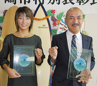今年8月に開催された第46回全日本サーフィン選手権大会で優勝を果たした南湖在住の三橋敬一さん(59)と、ひばりが丘在住の清永亜希子さん(35)(ともに日本サーフィン連盟湘南茅ヶ崎支部所属)の2人に「茅ヶ崎市特別表彰」が贈られた。同賞は個人や団体で文化、芸術、スポーツなどの分野において極めて顕著な功績を収めた人に贈られるもの。今回は三橋さんが同大会ショートボード・カフナクラスで、清永さんはショートボード・シニアウィメンクラスでそれぞれ優勝したことが評価され、受賞につながった。