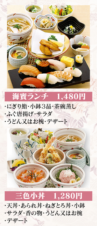 一押しメニューは「海賓ランチ」と「三色小丼」。ランチは大満足のボリュームで880円から1800円で用意されている。また、夜は本格的なふぐ料理を同店自慢の「自家製ぽん酢」で堪能できる。