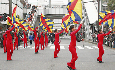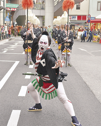 見所の一つ、江戸時代の装束をまとった奴頭が掛け声とともにポーズを決めると、沿道の観客からひときわ大きな拍手が送られていた。