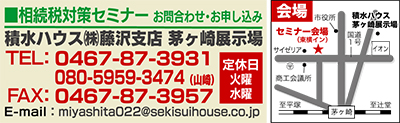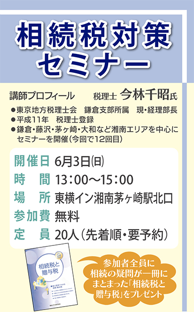 税理士による無料の「相続税対策セミナー」が6月3日(日)、東横イン湘南茅ヶ崎駅北口(茅ヶ崎1の2の53)で開催される。時間は午後1時から3時まで(12時40分受付け開始)。