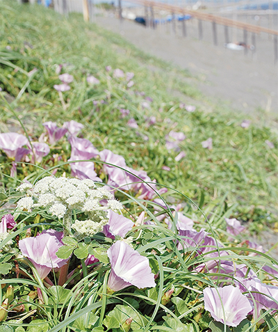 ハマヒルガオは日本各地に自生するヒルガオ科の多年草。直径5センチ程度でアサガオと似たラッパ型の花を咲かせる。特徴である長い根は防砂効果もあり、海岸浸食の激しい茅ヶ崎海岸では貴重な植物として愛されている。