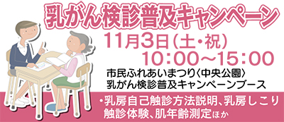 乳がんの早期発見、早期治療をめざして活動している全国健康保険協会神奈川支部(協会けんぽ)では、茅ヶ崎市と共催して11月3日(土・祝)、中央公園(茅ヶ崎市茅ヶ崎2-3-1)で開催される市民ふれあいまつりに出展し、乳がん検診普及キャンペーンを行う。時間は午前10時から午後3時まで。参加無料。乳がん検診の受診率を向上させて乳がん撲滅をめざす同会。当日は乳房自己触診方法の説明や、乳房しこり触診体験、肌年齢測定などが無料で受けられるほか、マンモグラフィ検診車の展示も予定。乳がんは早期発見が大切。日常生活の中で発見できる方法を教えてくれるこの機会にぜひ参加を。