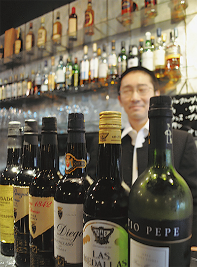 腰ぐらいの位置にグラスを持ち、高い位置から注ぐ理由は、グラスに至るまでにシェリー酒を空気に触れさせることで香をたたせるためだという。