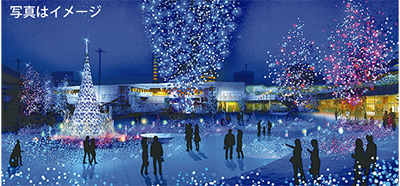 「湘南の太陽と星」をコンセプトにしたクリスマスイルミネーションは、1階ゲートスクエアを中心に、2〜3階のテラスと湘南ヴィレッジに、約26万球のLEDを配置。また1階ゲートスクエアには、シンボルモニュメントとして、高さ約4mのホワイトツリーが設置されている。点灯時間は午後5時から11時までとなっている。