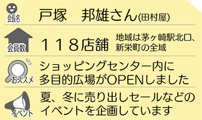 最近ではエメロード沿いの加盟店舗、茅ヶ崎ショッピングセンター内の空き店舗が「多目的広場」として改装オープン。個々の動きではあるが、市民との交流の場も増えている。