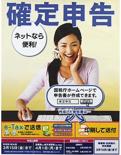 国税庁ホームページ(www.nta.go.jp)の「確定申告書等作成コーナー」なら、所得税・消費税・贈与税の申告書が、24時間いつでも自宅で作成できる。