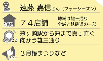 3月には地域資源を生かした「椿まつり」を開催。商店会の街灯には「椿まつり」のフラッグを早めにつけて告知し「個店ごとの自主性に任せつつ、盛り上げていきたいです」と自然体だ。これからも「人と人とのふれあいに重きを置いて活性化していきたい」と話していた。