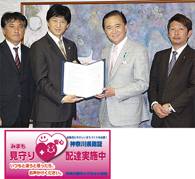 神奈川県はこのほど、乳製品の宅配を行う神奈川雪印メグミルク協会ほか2社と地域見守りで協定を結び、締結式を行った。