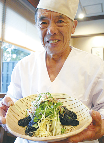 3月23日には増田屋(市内松林)で講習会を開き、組合員20人が参加。同店の古田島忠行さん=写真=が講師を務め、調理方法を実演し試食を行った。古田島さんは「自然健康食のそばに、さらに健康に良い野菜を加えました。体の疲れなどに効き美味しいので、味わってみてほしいです」と話す。