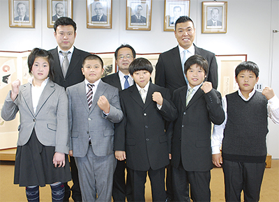 4月15日には小川道場長と出場選手、一杉剛弘(ひとすぎたかひろ)監督らが市役所へ表敬に訪れた。終始緊張した表情の選手たちを前に服部信明市長は「今までの練習を思い返して臨んでください。ケガに注意しながら、自分を信じて頑張って」と激励のコメントを送った。大将の佐藤君は「全国大会は何としても勝ちたいと思います」と意気込みを語った。