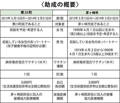 昨年末からの全国的な風疹流行の事態を受けて、茅ヶ崎市と寒川町は風疹の予防接種費用の一部助成することが決定した。妊娠を希望している女性と現在妊娠している女性の夫またはパートナーが対象者となっている。
