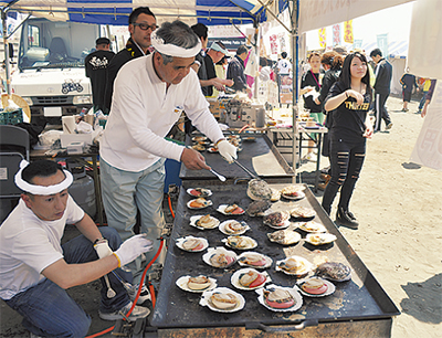 東日本大震災で被災した大槌湾ほたて養殖組合(岩手県)が市内で行われた湘南祭に出店し、多くの来場者に地元の味を振る舞った=写真。これは先ごろ茅ヶ崎湘南、茅ヶ崎、茅ヶ崎中央の市内3RCが合同で同組合に養殖で使用する器具などを支援したことを機に、この先も茅ヶ崎・大槌両市町間で交流を深め、大槌ほたてのブランド力を高めていこうと実現したもの。