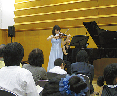 演奏会では毎回、ピアノ以外の楽器にも気軽に触れて欲しいと様々な楽器奏者によるミニ演奏会を企画。今回は日本フィルハーモニー交響楽団ヴァイオリン奏者の中谷郁子さんが、モーツァルト作曲のヴァイオリンソナタを披露した=写真。発表を行った生徒らは、プロによる本格的な演奏を真剣に聴き込んでいた。