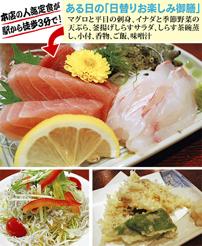 不動の人気を誇る「日替りお楽しみ御膳」(1580円)は勿論「しらす御膳」「お刺身御膳」「きんめ煮御膳」などお馴染みのメニューが堪能できる。