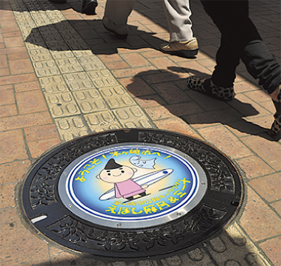 このほど茅ヶ崎市は下水道のマンホールに市の広報キャラクターである「えぼし麻呂・ミーナ」がデザインされた蓋を設置した。