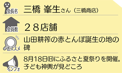 一年の中で賑わいをみせる催しは、共恵海岸通り自治会と共催で行う「ふるさと夏祭り」。今年は8月18日(日)に開催され、当日は子ども神輿も登場し活気溢れるイベントになる。さらに12月中旬にはサザン通り商店街、南本通り商店会と合同で行う恒例の歳末の大売り出し「サンテピアバザール」を実施する。会期中は抽選くじを配布し、最終日に行われる大抽選会「ガラポン」は買い物客を楽しませている。「夏祭りの活気ある子ども神輿や歴史ある山田耕筰の碑などを、ぜひ見に来てください」と三橋峯生会長は話している。