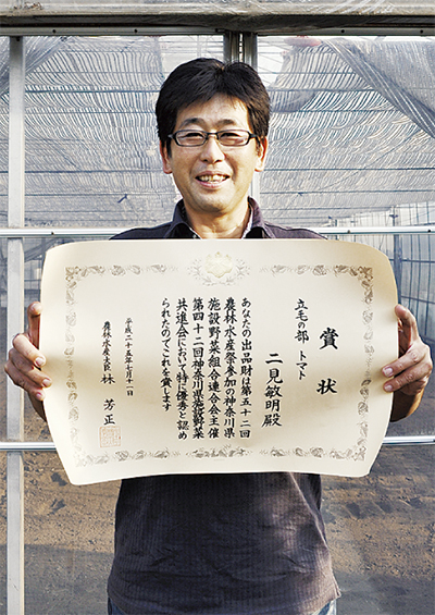 このほど茅ヶ崎市萩園在住で農業を営む二見敏明さん(51)が、第42回神奈川県施設野菜共進会で最高賞である農林水産大臣賞を受賞した。同共進会での獲得は市内では二見さんが初めてで、茅ヶ崎トマト農業の快挙となった。