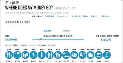 同サイトは、入力された納税者個人の年収から市民税の年総額を概算。その額に応じて、個人の税金が一日あたりどの分野にどれほど使われているかを自動的に表示する。各使途への配分比率は、茅ヶ崎市の2013年度予算説明書(一般会計)を参照している。