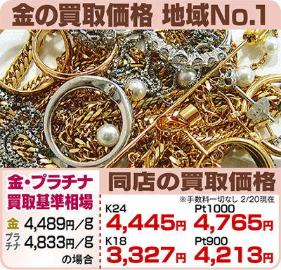 同店では毎日、HPや店頭で金の買取価格を公開。査定時には目の前で量った上で重さを教えてくれ、10円単位まで計算してくれるほか、商品価値を考慮して更なる上乗せも相談に乗ってくれる。その「安心感」から、小田原や横浜などの遠方からのリピーターも多く、複数の店舗と比較した大半の人が、同店に戻ってくるという。また、ブランド品の高価買取にも定評がある同店。「最近はどの店も高価買取を主張していますが、惑わされず、実際そのお店で査定して、比較するのが賢い売り方です」。