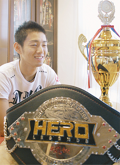 格闘技に出会ったのは緑が浜小1年の時。東京ドームでK-1の大会を観戦し、その熱量を目の当たりにした。運動は苦手だったが「とにかくピーター・アーツ選手やアンディ・フグ選手のように強くなりたい」と、地元の空手教室に通いだした。中学2年からは他の空手ジムの門をたたき空手漬けの毎日が始まった。「週1回だった練習が週7日になって大会などで勝てるようになりました」と振り返る。高校1年からキックボクシングを始め、2年生の時にプロデビューを果たした。