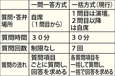 一問一答方式では、現行の一括方式と比べると論点や争点を明確にしやすくなる。また、制限時間は30分と変わらないが、質問回数の制限がなくなることや、質問・答弁場所が変更される=左表。議会事務局によると県内では平塚市、藤沢市のほか13市以上で導入されているという。