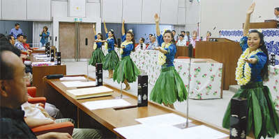 当日、広瀬忠夫議長はフラショーに先立ち「市民に開かれた議会を目指して、これからも様々な取り組みを行っていきたい」と挨拶。その後「カロケメレメレフラスタジオ/トカリガ」が出演し2曲を披露。議場では、アロハシャツを着用した「アロハビズ」姿の市議たちがフラショーを楽しんでいた。