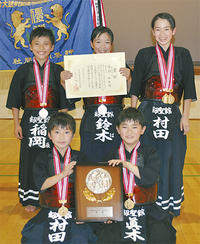 県内から40チームが出場し争われた小学生団体戦。 剱聖館は初戦、先方が2本勝ちし、幸先の良いスタートを切った。しかし続く次鋒、中堅と落とし、後がなくなったが副将の稲岡辰将くん(11)が2本勝ちし大将の村田七菜さん(11)に繋いだ。大将戦は引き分けに終わり、2勝2敗1分けとなったが、本数差で上回り勝利した。その後も強豪ひしめく中、チーム一丸となり一進一退の接戦をものにし、見事同道場始まって以来初となる県大会優勝を果たした。