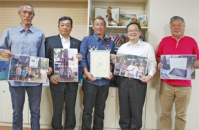 今年9月にホノルル市にあるワイキキ・クイーンズビーチで開催されたサーフィン大会「茅ヶ崎市長杯」。同大会の報告を兼ねて10月15日、関係者が服部信明市長を訪問した。