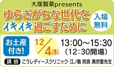 そんな心も体も変化が訪れる世代の方にむけての講演会「ゆらぎがちな世代をイキイキ過ごすために」が開催されます(主催/大塚製薬(株))。日時は12月4日(木)13時〜15時半。入場無料、定員60名。メールかFAXでの申込制で11月27日締切。会場は藤沢商工会館ミナパーク(藤沢駅徒歩3分)。