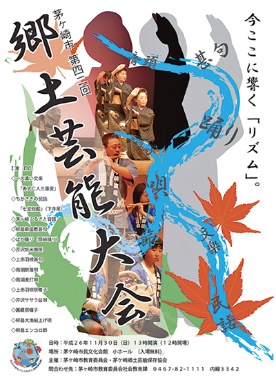 当日は、茅ヶ崎市内を中心に活動する保存会など9団体のほか、県立茅ケ崎高校文楽部、中島中学校の生徒が出演。市内各地で古くから伝わる祭り囃子や祝い唄、甚句、民謡などの民俗芸能、民話や民踊、文楽などが披露される。