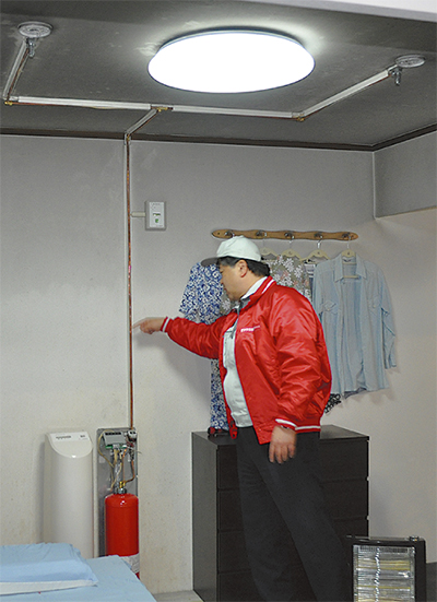 スプリネックスミニは高さ80cmほどで約30cm四方の床に設置が可能。天井に設置する定温式と差動式の2種類の感知器が火災を素早く感知。水の約4倍の消火性能をもつ9リットルの薬剤で約26・5秒間放射し自動消火する。防護面積は約4・5畳で、電源や薬剤は本体に内蔵されているため停電時も機能するという。