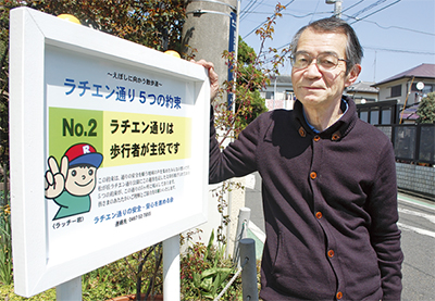 子どもにも親しんでもらおうと、野球帽をかぶった少年のキャラクター「ラッチー君」も発案し、デザイナー経験のある遠藤さんが描いた。「この約束を通じ、皆さんにラチエン通りを『譲り合いの道』とイメージして行動に移してもらえたら」と遠藤さん。「今後も安全で安心でき、親しみのある道になるよう、様々な活動を続けていきたい」と話した。