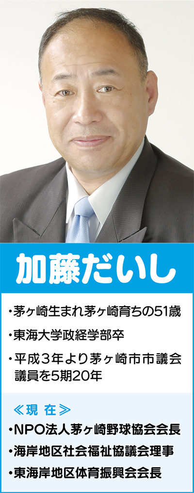 市議会議員数を4議席削減する、定数削減に取り組みます。無駄なく効率の良い税金の使い方を推進して参ります。