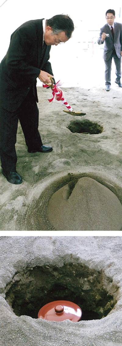これはプロテスタント系キリスト教会の地鎮祭にあたる儀式。当日は関係者ら約50人が参列し、讃美歌を斉唱。壺に入れた聖書を、新築される教会堂の説教壇の真下に埋める作業が五十嵐牧師らによって行われた。